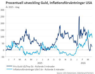 Sedan dess har guldpriset sett en dramatisk korrigering nedåt. Det visar, utöver fundamentala drivkrafter, på en klassisk marknadsmekanism där osäkerheten inför en konflikt ofta är mer kursdrivande än själva konflikten i sig, den så kallade ”buy the rumour, sell the fact”-dynamiken.