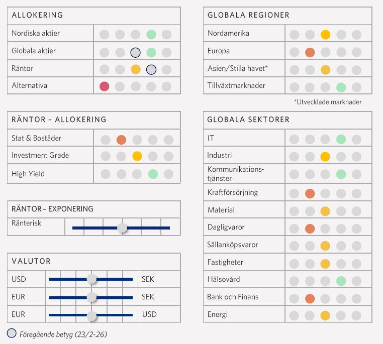 Vi har under en längre tid haft en positiv marknadssyn och inväntat ett bra läge att öka upp risken i portföl-jerna. I februari uppstod ett sådant läge så därför sänkte vi betyget på räntor till neutralt samtidigt som vi höjde betyget på globala aktier till en lätt övervikt. Därmed är vi nu positiva till både nordiska och globala aktier.