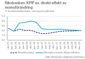 Riksbanken å sin sida ser höjningar från i sommar som fortsätter under hösten. Riksbankens alternativscenario visar att styrräntan toppar på i snitt 2,66 procent för första kvartalet 2027 för att sedan gradvis falla mot cirka 2,35 procent vid årsskiftet 2028/2029. De nämner även en alternativ penningpolitik som skulle innebära att inledningsvis avvakta, med risk för att behöva strama åt mer kraftfullt längre fram vilket skulle medföra större kostnader för hushållen. Det senare alternativet var det som skedde i samband med covid.