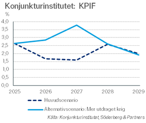 Konjunkturinstitutet ser då att styrräntan i snitt blir 0,1 procentenhet högre (årssnitt på 1,9 procent) än i huvudscenariot för 2026 och att räntan toppar på 3,5 procent 2028, innan den åter faller.