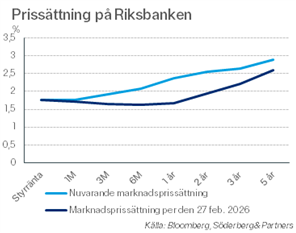 Med energikrisen 2022 i färskt minne har investerare på räntemarknaden reagerat kraftfullt sedan krigsutbrottet. Marknaden prissätter för närvarande två till tre räntehöjningar om 0,25 procentenheter vardera inom tolv månader. Det innebär att marknaden i princip har tillskrivit samma sannolikhet till Riksbankens huvudscenario som alternativscenario.