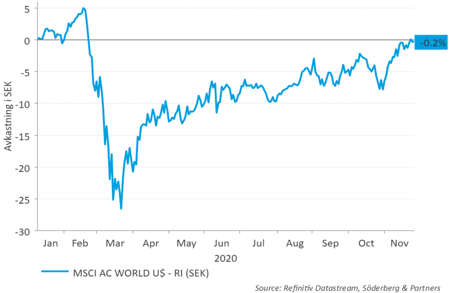 Trots nya drastiska åtgärder för att hindra smittspridningen av coronaviruset och ett vintermörker som tränger sig på ser vi goda förutsättningar för att den starka trenden för risktillgångar kan fortsätta. När nu det amerikanska valet inte innehåller några direkt negativa implikationer för investeringsklimatet ser vi på nytt att fokus blir framåtblickande, bortom den nuvarande smittspridningen och coronarestriktionerna. Detta tack vare de positiva vaccinnyheterna, där flera kandidater uppvisar goda resultat och kan börja distribueras inom några månader. Förvisso till stor del väntat i marknadens prognoser men innebär ändå att en potentiell risk minskar.
