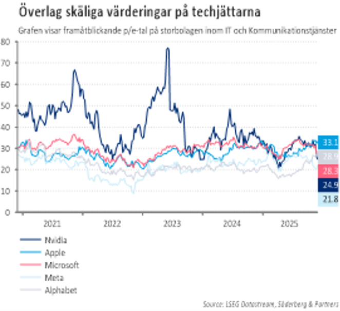 Även bland de stora teknikbolagen finns en viss sårbarhet. Dyra värderingar bygger delvis på att AI-utvecklingen och digitalisering fortsätter i en snabb takt. Om tillväxten skulle sakta ner, om konkurrens hårdnar, eller om regulatoriska och makroekonomiska risker ökar, kan värderingar komma att testas. Att det är en bubbla som skulle spricka är dock osannolikt.