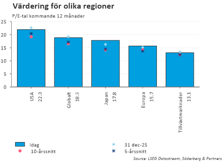 Att amerikanska börsen fallit har bidragit till att aktievärderingen för ett världsindex sjunkit, men fler regioner än bara USA ser alltså attraktiva ut.