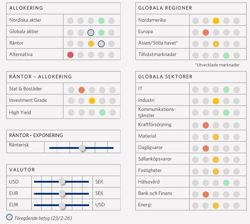 Vi har under en längre tid haft en positiv marknadssyn och inväntat ett bra läge att öka upp risken i portföljerna. I februari uppstod ett sådant läge så därför sänkte vi betyget på räntor till neutralt samtidigt som vi höjde betyget på globala aktier till en lätt övervikt. Därmed är vi nu positiva till både nordiska och globala aktier. Motiveringarna till omallokeringen går att läsa om under Portföljstrategin.