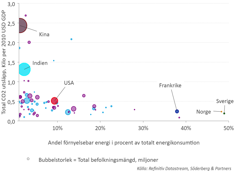Nordiska länder, däribland Sverige och Norge, är bland de länder som släpper ut minst andel koldioxidutsläpp samtidigt som uppemot 50 procent av dess totala energikonsumtion kommer från förnyelsebara energikällor.