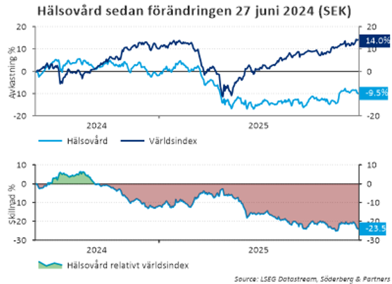 Den 27 juni 2024 sänkte vi betyget på hälsovårdssektorn från tidigare ljusgrönt till neutralt. Den 14 oktober 2025 höjde vi betyget tillbaka till ljusgrönt, då vi gör bedömningen att det värsta ligger i backspegeln för sektorn och att en återhämtning nu står för dörren.