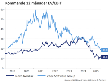 De senaste månaderna har vi köpt aktier i Novo Nordisk och Vitec Software till portföljen. Vi bedömer att båda bolagen kommer göra en positiv vändning under 2026 som aktiemarknaden för närvarande inte prisat in. Bortsett från i år har bolagen historiskt vuxit starkt med stigande lönsamhet. Som en följd av att 2025 blivit ett något svagare år ligger deras nuvarande värdering under den nivå som var vid coronabotten – något vi ser som en överreaktion på nedsidan.