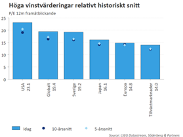 De större globala regionerna handlas idag över sina historiska fem- och tioårssnitt. Medan USA handlas tydligare över snittet är skillnaden högst marginell i Europa. Det är också värt att notera att det är tillväxtbolagen som lyft börsen mest i den återhämtning som vi sett i USA det senaste knappa halvåret.
