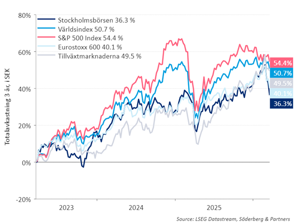 Ta del av aktuell börsutveckling på världens börser, i lokal valuta och i svenska kronor.