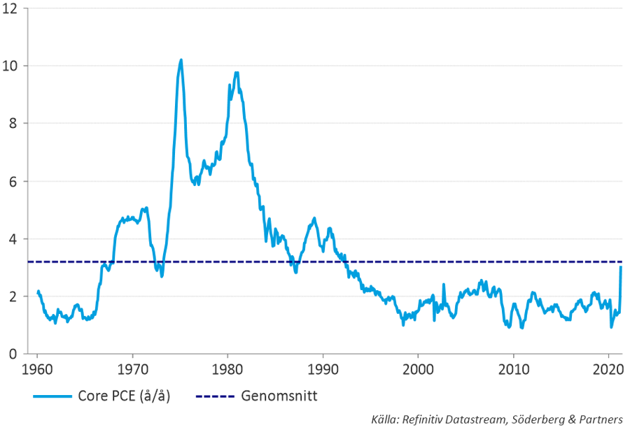 Veckan öppnade med amerikanskt konsumentförtroende som kom in oförändrat jämfört med tidigare månad. Hushållen har blivit mer optimistiska kring nuvarande situation men förväntansindexet föll tillbaka något då optimismen om kommande jobb- och inkomstmöjligheter sjunkit. Det gör nästa veckas sysselsättningsrapport otroligt spännande. Att stigande konsumentpriser urholkar hushållens köpkraft kan också bidra till den mer pressade framtidstron hos hushållen. Konsumentförtroendet påverkas även av bostadsmarknaden som förstärktes när data visade att amerikanska bostadspriser steg 1,4 procent i mars, jämfört med föregående månad, och klättrade 13,9 procent jämfört med samma månad 2020. Det är delvis en effekt av låga räntor och den tydliga hemmajobbartrend vi sett sedan coronautbrottet. Svenska KI-barometern, som visar stämningsläget i svensk ekonomi, steg i maj till den högsta nivån i indikatorns 25-åriga historia. Med en stark svensk bostadsmarknad och en arbetsmarknad som förbättras är förutsättningarna goda för att styrkan håller i sig även resten av året. Veckans höjdpunkt var inflationen enligt Feds favoritmått PCE, som kom in på 3,1 procent i årstakt mot väntade 2,9 procent. Eftersom vi redan fått KPI för april där vi såg den största överraskningen någonsin, låg prognosen närmare utfall denna gång.