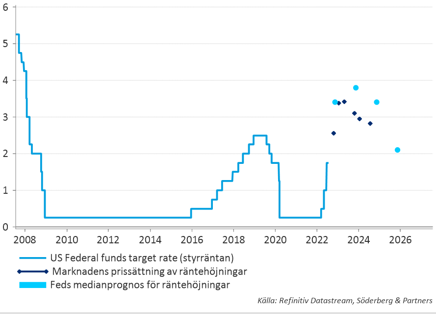 Först ut på veckans makroagenda är det tyska indexet över affärsklimatet, IFO, som likt föregående månad väntas falla. Detta följs upp av Feds möte under tisdagen och onsdagen, som kulminerar med att vi på onsdag kväll får ett nytt besked för den amerikanska styrräntan. Väntat är att man precis som i juni genomför en höjning med 75 punkter, men efter att inflationstakten i juni landade på höga 9,1 procent har röster höjts gällande en eventuell höjning med 100 punkter. De flesta bedömare tycks vara av åsikten att detta är osannolikt, men det är långt ifrån omöjligt. Såväl utfallet för styrräntan som hur Fed, med ordförande Powell i spetsen, kommunicerar kring detta kommer ha stor påverkan på marknadsutvecklingen i veckan. Detta följs upp på torsdagen med sentimentssiffror för både Sverige och Eurozonen samt svensk BNP-statistik. Senare under torsdagen presenteras även preliminär tysk inflationsstatistik för juli. Den tyska inflationen väntas falla i årstakt, även om månadsförändringen väntas vara positiv. Veckan avslutas med att vi under fredagen får ta del av statistik över svensk arbetslöshet. Fredagen bjuder även på preliminära inflationssiffror från Eurozonen samt preliminär BNP-statistik från såväl Tyskland som Eurozonen.
