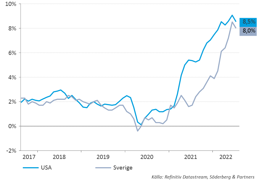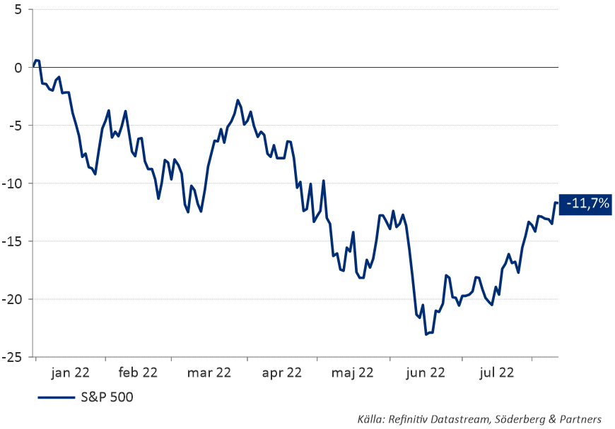 Efter juli månads kraftiga återhämtning fick aktiemarknaderna ånyo fart under veckan som gick. Fullt fokus låg förstås på den amerikanska inflationen som kom in lägre än väntat. En välbehövlig lättnad för marknaderna där aktier steg och den amerikanska dollarn föll, en välbehövlig respit för omvärlden. Initialt föll även marknadsräntor, framför allt i kortare löptider, men sett över hela veckan blev det inga större ränterörelser i USA. Även svensk inflation presenterades under fredagen vilket fick svenska räntor i kortare löptider att falla tillbaka. Under sommaren har marknaderna tydligt skiftat fokus bort från inflation till att fokusera mer på tillväxtutsikterna. Den ökade oron kring vad centralbankernas räntehöjningar kan göra för skada på ekonomin har satt en tydlig prägel, varför bättre (eller mindre dåliga) nyheter kring inflationen ger ökat hopp om kursändringar från centralbankshåll. Bolagens kvartalsrapporter är i princip nu förbi och återigen vittnar bolagen om att de lyckats parera ökade kostnader och bibehållit marginalerna. I USA har nu cirka hälften av nedgången återtagits medan vi i Sverige endast har återtagit en tredjedel. Ser man historiskt brukar sådana rörelser innebära att man nu har sett börsbotten för innevarande cykel, men osvuret är förstås bäst.