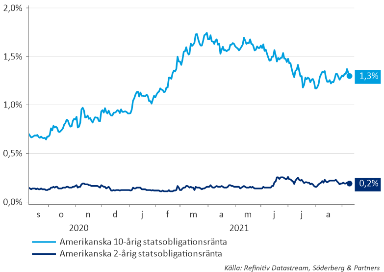 Veckan bjöd på sentimentsindikatorer där tyska ZEW visade på en mer dämpad bild av både nuläge och framtidsutsikter. Indexet över framtidsutsikterna föll till 26,5 från 40,4 månaden innan. Nuläget steg å andra sidan till 31,9 från föregående månads indexnivå på 29,3 men var lägre än prognosen på 33. Beige Book, sammanställningen över de olika amerikanska Fed-distriktens ekonomiska utveckling presenterades i onsdags. Sammantaget visade Beige Book en något avtagande aktivitet. ECB meddelade att de lämnar styrränta och tillgångsköp oförändrat i torsdags. Takten i tillgångsköpen justeras dock ned något, vilket är en anpassning efter de senaste månadernas högre tempo. I fredags presenterades amerikansk inflationsstatistik i form av PPI (producentprisindex). Utfallet var något högre, +0,7procent månad över månad, än förväntningarna på +0,6 procent men lägre än föregående månads utfall på +1,0 procent. Inflationsoron var påtaglig i våras men marknaden och centralbankerna gör bedömningen att den nuvarande höga inflationstakten är övergående. Den ryska centralbanken höjde styrräntan i veckan, vilket är ytterligare ett tecken på de kraftigt skilda förutsättningarna mellan de utvecklade länderna och flera länder på tillväxtmarknaderna.