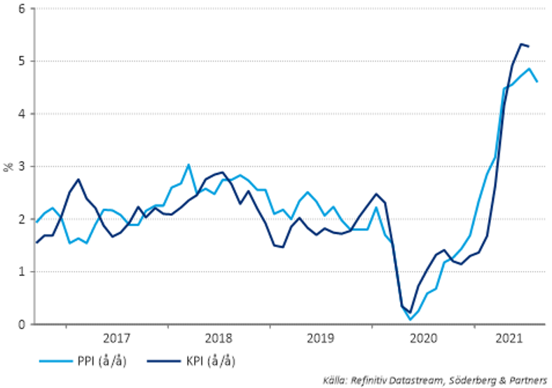 Efter besvikelsen från augusti månads sysselsättningsrapport är det i veckan dags för Feds andra huvudparameter för den framtida penningpolitiken. Veckan bjuder på viktig inflationsstatistik som tillsammans med utvecklingen på arbetsmarknaden är avgörande för när åtstramningen av obligationsköpen kan påbörjas. Vi står fast vid vår tidigare bedömning att den senaste uppgången i inflationen i första hand är driven av tillfälliga faktorer såsom dyrare råvaror, högre transportkostnader, brist på halvledare och inte minst av högre priser på begagnade bilar. Faktorer som så småningom kommer att klinga av i takt med att baseffekterna och pandemirelaterade faktorer ebbar ut. På onsdag väntas svensk inflation komma in på 1,7 procent i årstakt och den amerikanska på 5,3 procent i årstakt. På torsdag får vi ta del av den så viktiga detaljhandelsstatistiken från USA där urholkad köpkraft från den stigande inflationen och avtagande finanspolitiska stimulanser bidrar till mer pessimistiska amerikanska hushåll, vilket börjar synas i den avtagande farten i detaljhandeln. Förhandstipsen tyder på en försvagning jämfört med föregående månad.