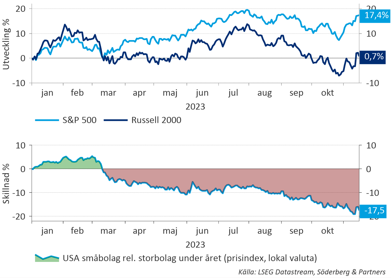 Inflationssiffran förde med sig ett betydligt muntrare börssentiment, som inte minst syntes på Stockholmsbörsen. Trots att svenska företag går väldigt bra, med en vinsttillväxt på omkring 20 procent under året, så har svenska aktier kraftigt underpresterat relativt sina globala kollegor. Om marknaden nu får mer klarhet i centralbankernas nästa steg så kan det bidra till ett ökat risksentiment, vilket vore positivt för Stockholmsbörsen och vår övervikt mot Nordiska Aktier. Vi bedömer också att småbolag, bland annat i Sverige, kommer gynnas av det mer positiva marknadssentimentet.
