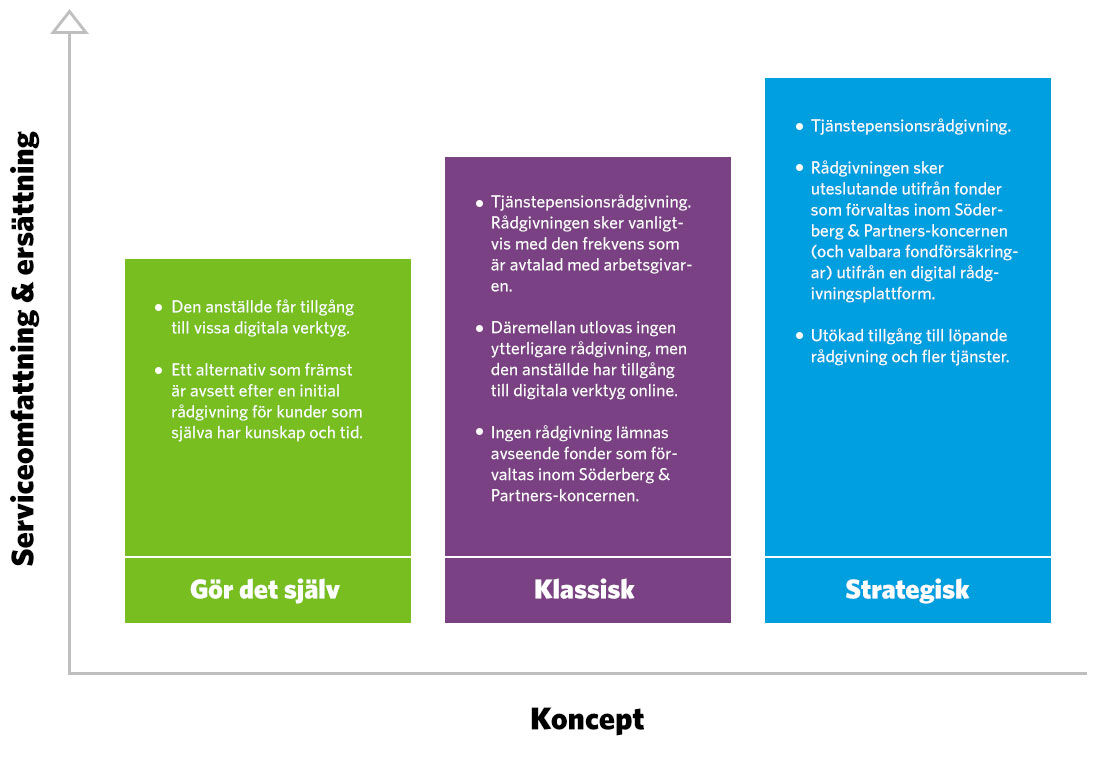 Inför rådgivning av detta slag erbjuds företagens anställda vanligtvis att välja mellan: personlig rådgivning och Gör-det-själv. De olika koncepten innebär olika nivå av service och också olika prissättning. Vilket koncept de anställda väljer sätter också förutsättningarna för den kommande rådgivningen, och även produktutbudet, servicen och tekniken beror på val av koncept.